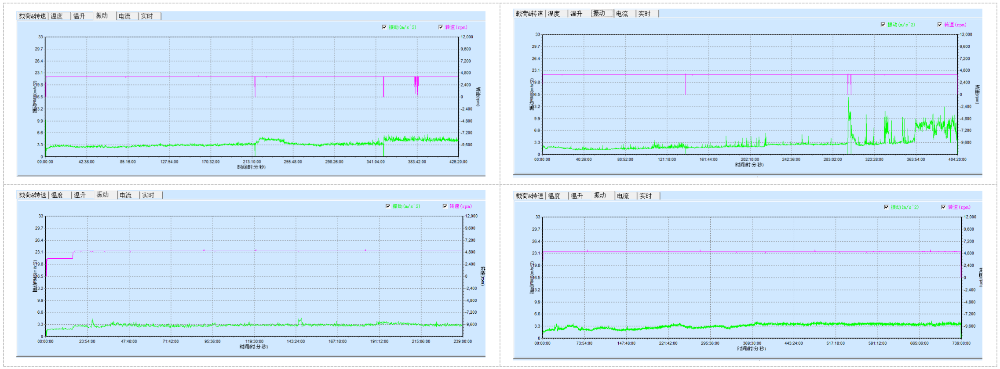 對整個試驗(yàn)工裝的振動情況進(jìn)行記錄,對每一時刻的振動值進(jìn)行記錄,在整個測試中的振動趨勢變化可以全程跟蹤軸承的狀態(tài),是否出現(xiàn)異常以及異常的趨勢變化,分析軸承在測試中哪一階段開始出現(xiàn)異常,是否出現(xiàn)打滑等狀況;